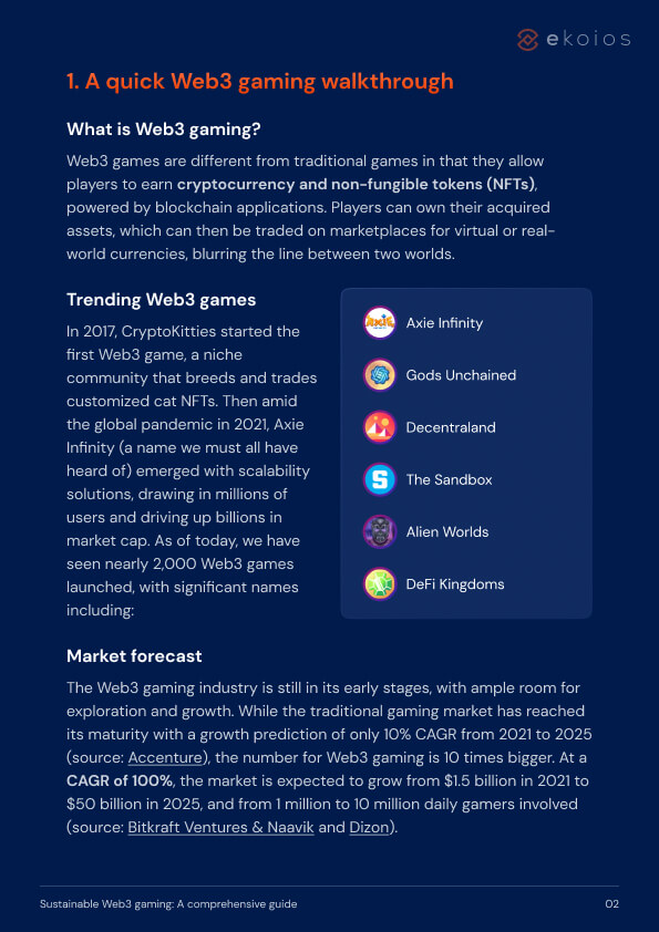 In “Sustainable Web3 Gaming — A Comprehensive Guide”, we delve into the booming world of decentralized entertainment. With a current value of $1.5 billion and over 1 million active players, this sector is expected to take over the gaming industry with projections to grow tenfold by 2025.
