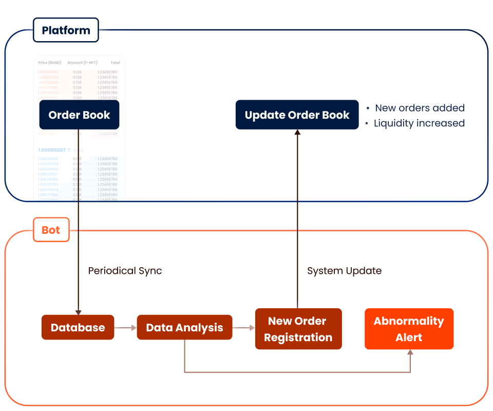 ご依頼を受け、金融とブロックチェーンの専門家で構成される私たちのチームは、業界領域を入念に調査し、マーケットメイキングボットの開発を提案するためにプラットフォームを分析しました。ボットは集中取引所のオーダーブックから注文を同期し、それらを分析した後、プラットフォームに属する口座間で注文を実行します。ボットによって発注された注文はプラットフォームによって処理され、ライブ・オーダーブックに表示されます。