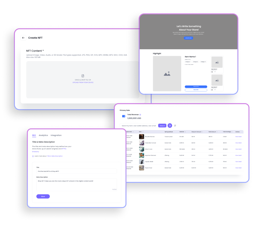 NFTifyは、Web3の愛好家なら誰でも、コーディングや先行投資なしNFTビジネスを構築、販売、成長させることができるノーコード NFT マーケットプレイス ソリューションです。ユーザーはNFTストアフロントを完全にカスタマイズし、NFTをさまざまな方法で販売できるようにリストアップし、内蔵のマーケティングツールでサイトを宣伝できます。
