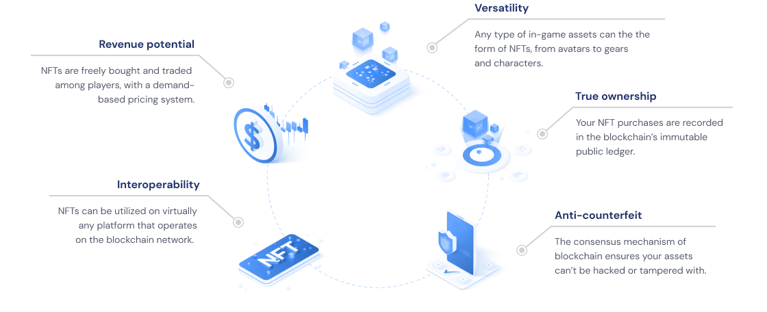 게임 내 모든 유형의 자산은 아바타에서 장비 및 캐릭터에 이르기까지 NFT 형식일 수 있습니다.